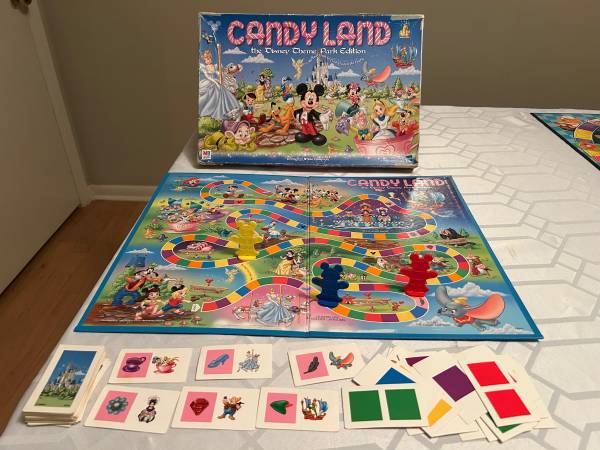 1.) CANDYLAND, THE DISNEY THEME PARK EDITION from 2001....it includes 1 gameboard, 3 gingerbread playing pieces with mouse ears, and 62 cards.