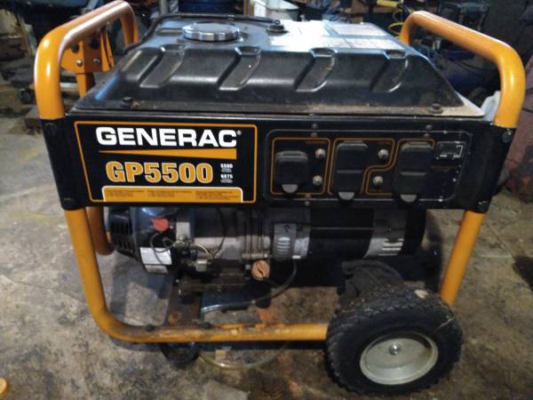 GENERAC GP 5500/6875 watt generator with 298cc ohv engine, starts first try. 120 / 240v 60Hz power, four 120v outlets and one 240 twist lock outlet.