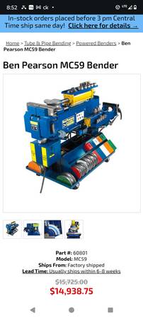 Nice Ben Pearson pipe bender with dies. It bends pipe up to 3" with ease. Any questions please send me a text and I'll call you back a.s.a.p. I can't usually answer when at work. $4500.00 Thanks for...