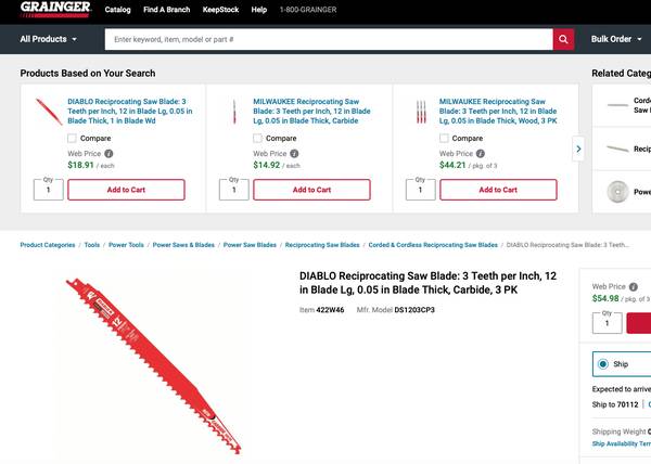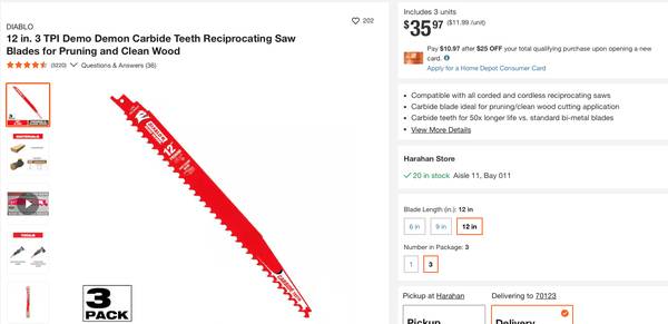 12" 3TPI Demo Demon Carbide Teeth Reciprocating Saw Blades for Pruning and Clean Wood (3-pk)