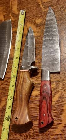 The Cleaver is sold.3 Handmade Damascus Knives, your choice of 1, $45.00 each. $100.00 for the 3, I do trade! Never used, To Me they Need a little fine tuning on the Handles, to fit the User's hand? Make a Fair Offer on the 3 left, and I do trade!