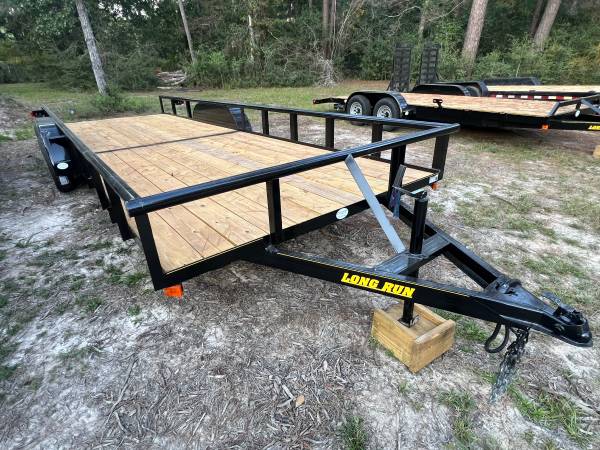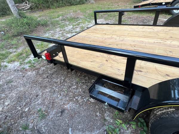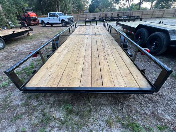 New 7 x 22 Pipe Top Utility Trailer : tandem 3500# Dexter axles : brakes on rear axle : Treated 2x8 decking : 15”wheels with radial tires : Welded spare tire mount : set back jack : 2” coupler :...