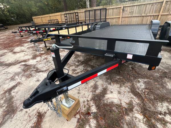 New 82”x20’ 10K steel deck car hauler Spare tire mount HD Set back jack Tandem 5200# Dexter axles Boxed LED lights 5’ slide in ramps 15” rims,radial tires 1 year factory warranty 1 year same as cash...